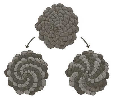 또한 솔방울이나 해바라기의 나선 형태에서도 피보나치수열을 찾을 수 있습니다. 아래 그림의 솔방울의 경우 시계 방향은 8개의 나선이 시계 반대 방향은 13개의 나선이 있습니다.