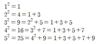 피보나치는 제곱 수에 대한 연구도 하였습니다. 제곱 수는 몇 개의 홀수의 합으로 나타낼 수 있음을 발견하였습니다.